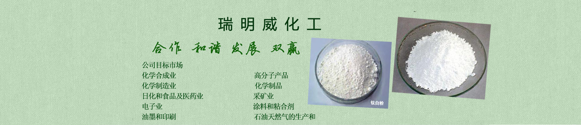 天津市瑞明威化工有限公司公司概況公司本著“興業(yè)、興人、興社會”的三興企業(yè)文化在業(yè)內(nèi)有著崇高的聲譽產(chǎn)品覆蓋面大,銷售輻射華東、華南、華北數(shù)百種產(chǎn)品,多種銷售模式可供選擇華東、華北、沿海、沿江長期包租有儲罐和倉庫提供個性化的完全服務(wù),解決用戶在化學(xué)品使用中的一切煩惱供應(yīng)鏈外包 個性化定裝與標簽 來料加工業(yè)務(wù) 分包裝 化工超市 買方庫存管理公司目標市場化學(xué)合成業(yè) 高分子產(chǎn)品化學(xué)制造業(yè) 化學(xué)制品日化和食品及藥業(yè) 采礦業(yè)電子業(yè) 涂料和粘合劑油墨和印刷 石油天然的生產(chǎn)和提煉